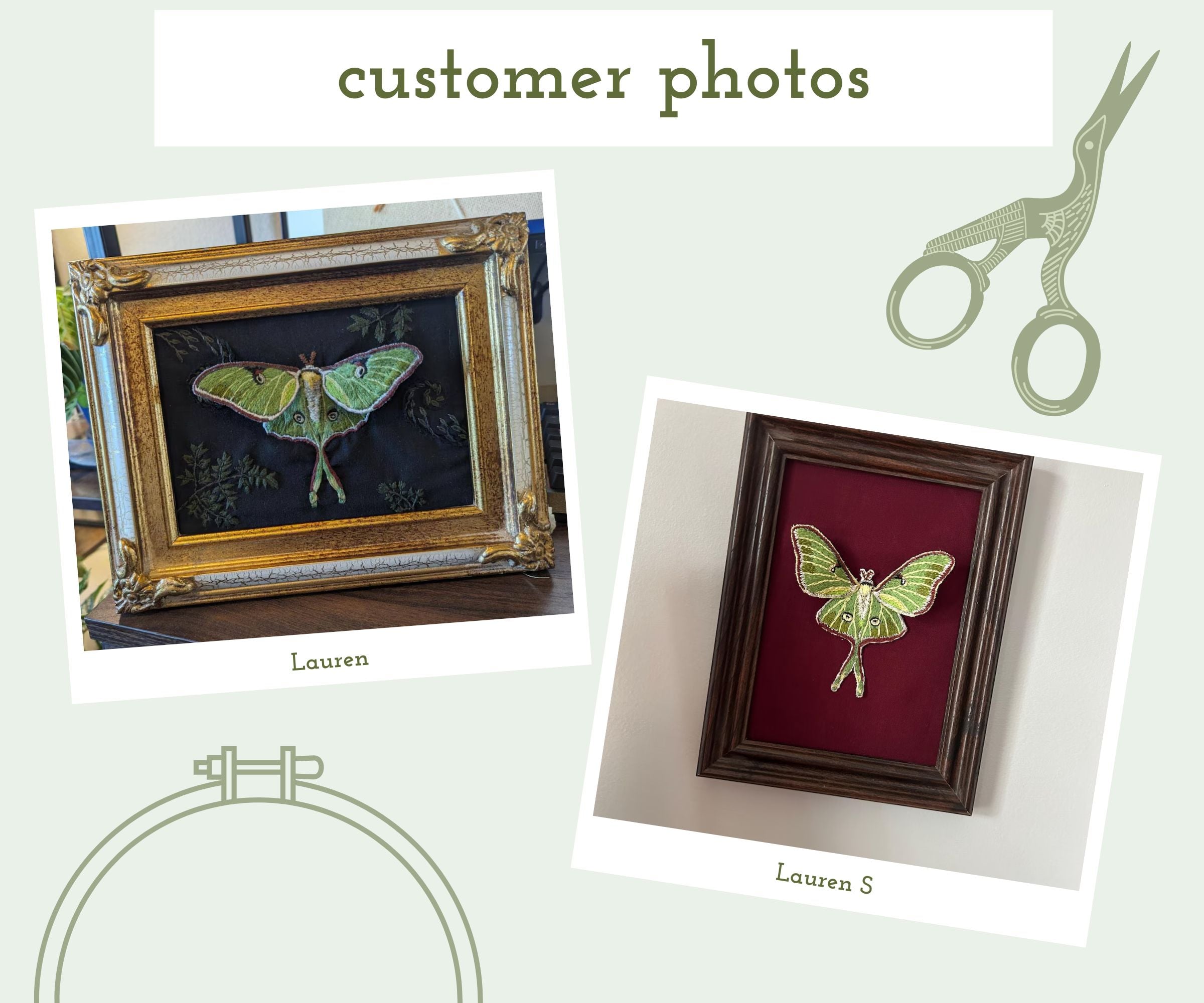 This is a digital download PDF file containing instructions for a stump work Luna moth embroidery pattern. The pattern fits in a 5 or 6 inch embroidery hoop when it’s finished.