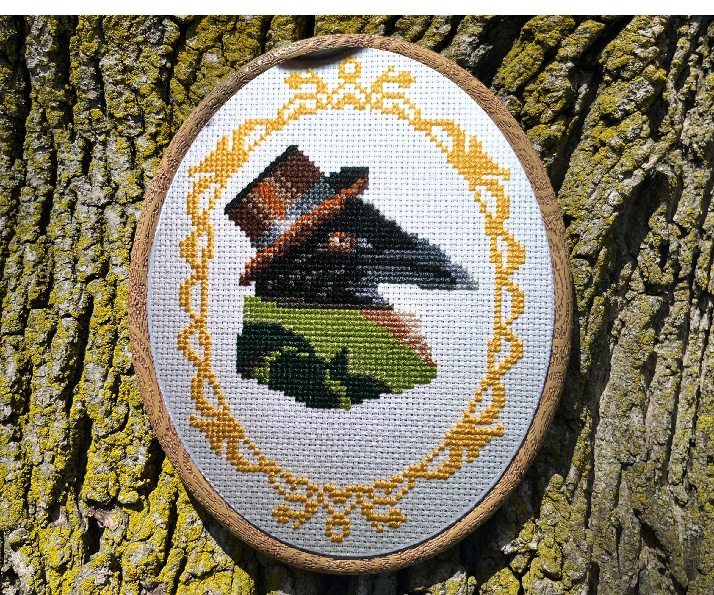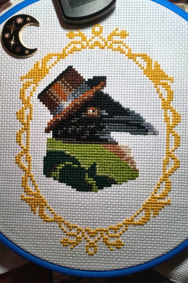 This distinguished gentleman is wearing a top hat and a green overcoat. One of my favorite parts of this pattern is the gold ornate frame that surrounds the raven. This quirky pattern would make a good gift for a bird lover. It’s a great introduction to cross stitch since it uses whole cross stitches throughout and comes with lots of helpful instructions to get started!
